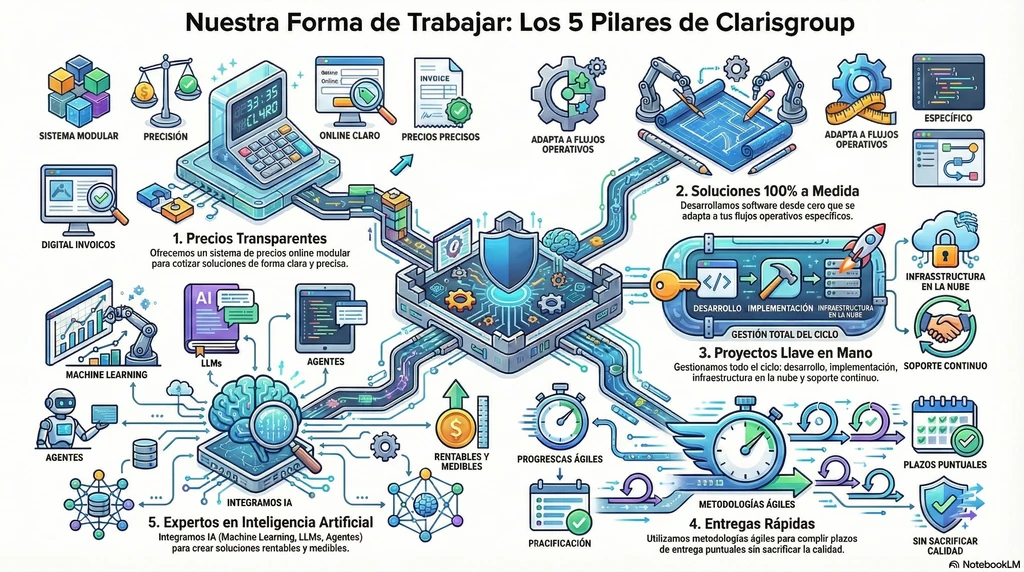 En Claris Digital Tech, la transparencia en la estructura de precios es un pilar fundamental. Reconocemos que en el entorno B2B, donde las decisiones involucran múltiples stakeholders y presupuestos complejos, la claridad es esencial para construir confianza duradera. Por eso contamos con un sistema de precios online que permite cotizar y configurar soluciones de manera intuitiva, eliminando la opacidad tradicional de las negociaciones comerciales.